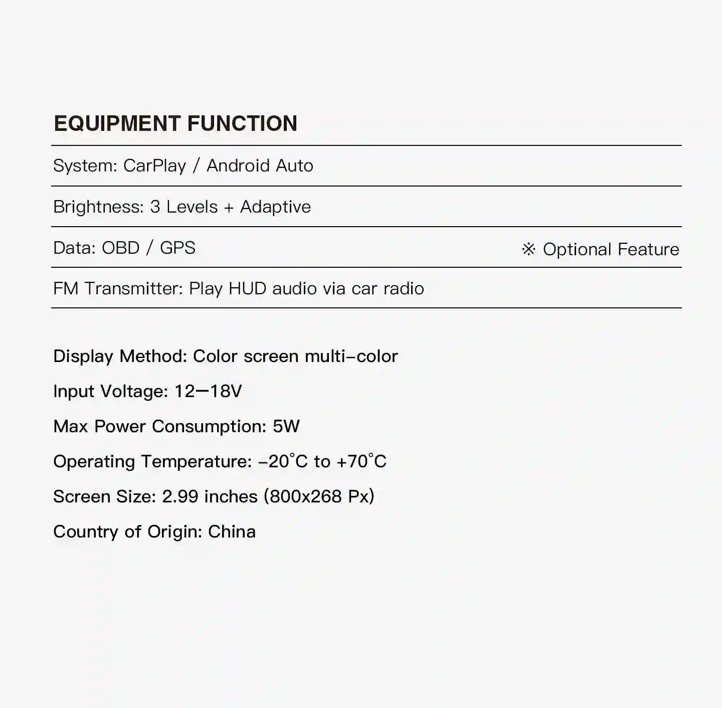 With an ultra-wide 268×800-pixel horizontal display, this HUD delivers far more visible information than standard 240×120 units. The expanded horizontal resolution provides clearer navigation routes, wider field-of-view indicators, and sharper text, so key driving data is easier to read without distraction. More pixels mean richer detail, smoother graphics, and a cleaner layout that keeps critical information in your line of sight.